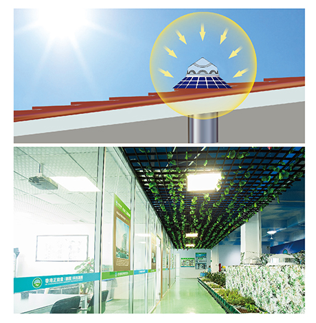 三、漫射區:由漫射器將采集的光線更均勻、柔和,更大面積地擴散到室內需要照明的各個地方。從黎明到黃昏甚至陰天或雨天,該照明系統導入室內的光線仍然十分充足。結合光伏發電裝置及特制LED燈具還能實現24小時全天候照明!