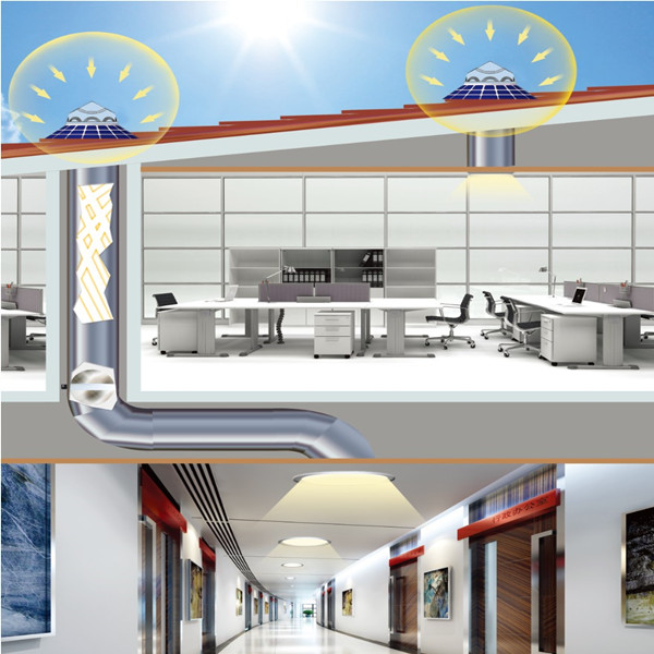 導光筒系統原理其實也很簡單,他主要由集光器、導光管和漫射器三個部分構成的,分別通過采光區、傳輸區和漫射區進行工作。即集光器捕獲陽光、經導光管傳輸、最后由漫射器均勻擴散到室內,照射出來的光線柔和自然,不僅保證日間室內的照明能效,還可以最大限度地減少閃爍,還能過濾90%以上的有害紫外線、紅外線,導入室內的光線達到全光譜、無頻顯、無眩光,顯色指數達97以上,使工作環境更加舒適,減少長期處在燈光下引起的視覺疲勞,保護眼睛、杜絕近視,而提高工作效率。