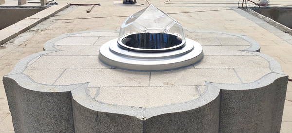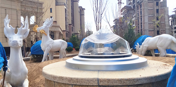花型和圓形的蹲座與無電照明系統鉆石型采光器相得益彰,極具藝術氣息,瞬間就拉升整個小區的綠色景觀品位!目前為止,筆者也是第一次見到大理石花型的墩座,高檔小區配置就是高規格!